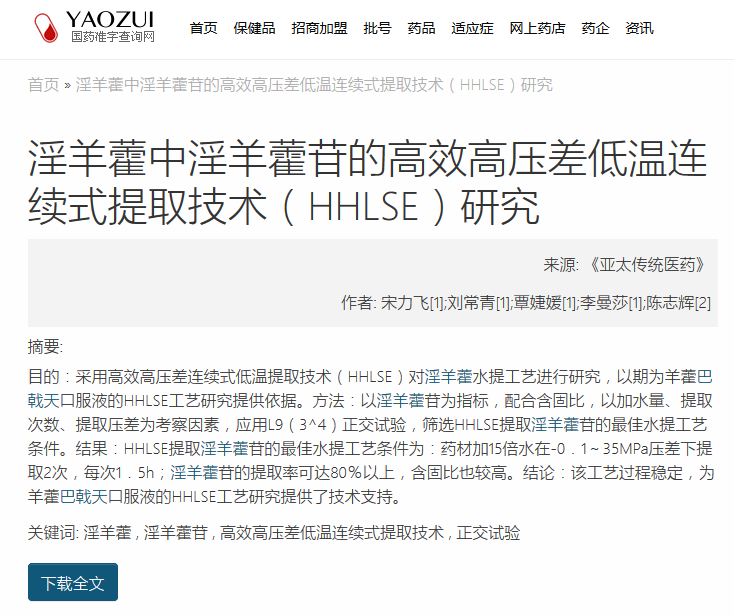 【关键词】淫羊藿 淫羊藿苷 高效高压差低温连续式提取技术 正交试验