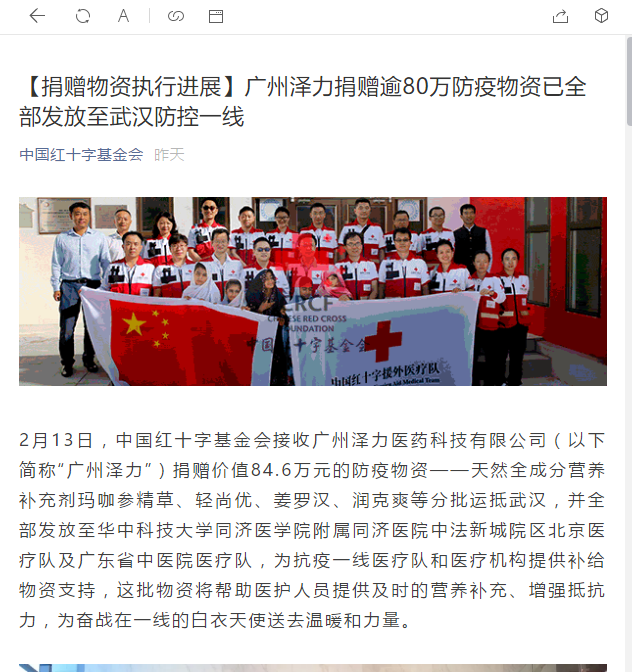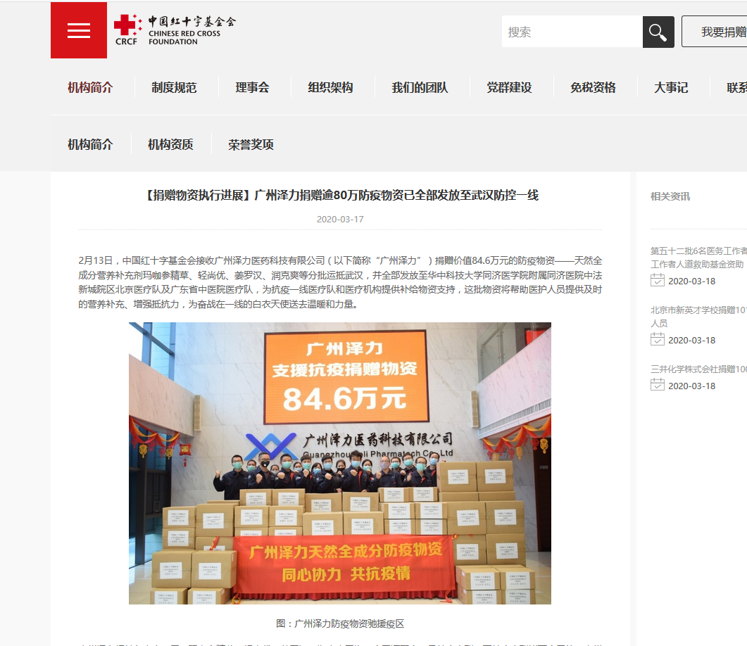 2月13日,中国红十字基金会接收广州钱柜娱乐官网医药科技有限公司(以下简称“广州钱柜娱乐官网”)捐赠价值84.6万元的防疫物资——天然全成分营养补充剂玛咖参精草、轻尚优、姜罗汉、润克爽等分批运抵武汉,并全部发放至华中科技大学同济医学院附属同济医院中法新城院区北京医疗队及广东省中医院医疗队,为抗疫一线医疗队和医疗机构提供补给物资支持,这批物资将帮助医护人员提供及时的营养补充、增强抵抗力,为奋战在一线的白衣天使送去温暖和力量。